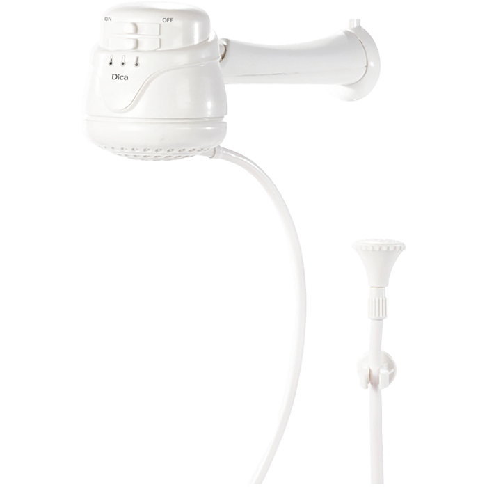 Regadera eléctrica con la función de seleccionar tres niveles de temperatura (frío, tibio, caliente). Incluye brazo, chapetón, y una práctica regadera de mano.